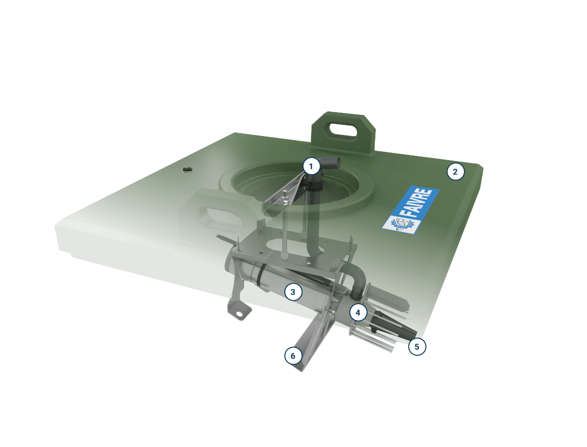 Une turbine déprimogène spéciale et tournant à 3000 t/min est fixée à l’extrémité de l’arbre moteur. L’air qui arrive par le tube de guidage est aspiré au centre de l’hélice par effet VENTURI. L’air mixé avec l’eau est diffusé en micro-bulles dans le courant d’eau créé et orienté vers le fond. La quantité d’oxygène transférée est optimum car les micro-bulles ont une très longue durée de séjour dans le volume d’eau poussé.