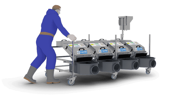 Un trolley inox sur roues permet de rassembler les compteurs sur une structure unique (4 compteurs max.), facilitant ainsi la mise en place et le transport des compteurs dans l’exploitation.