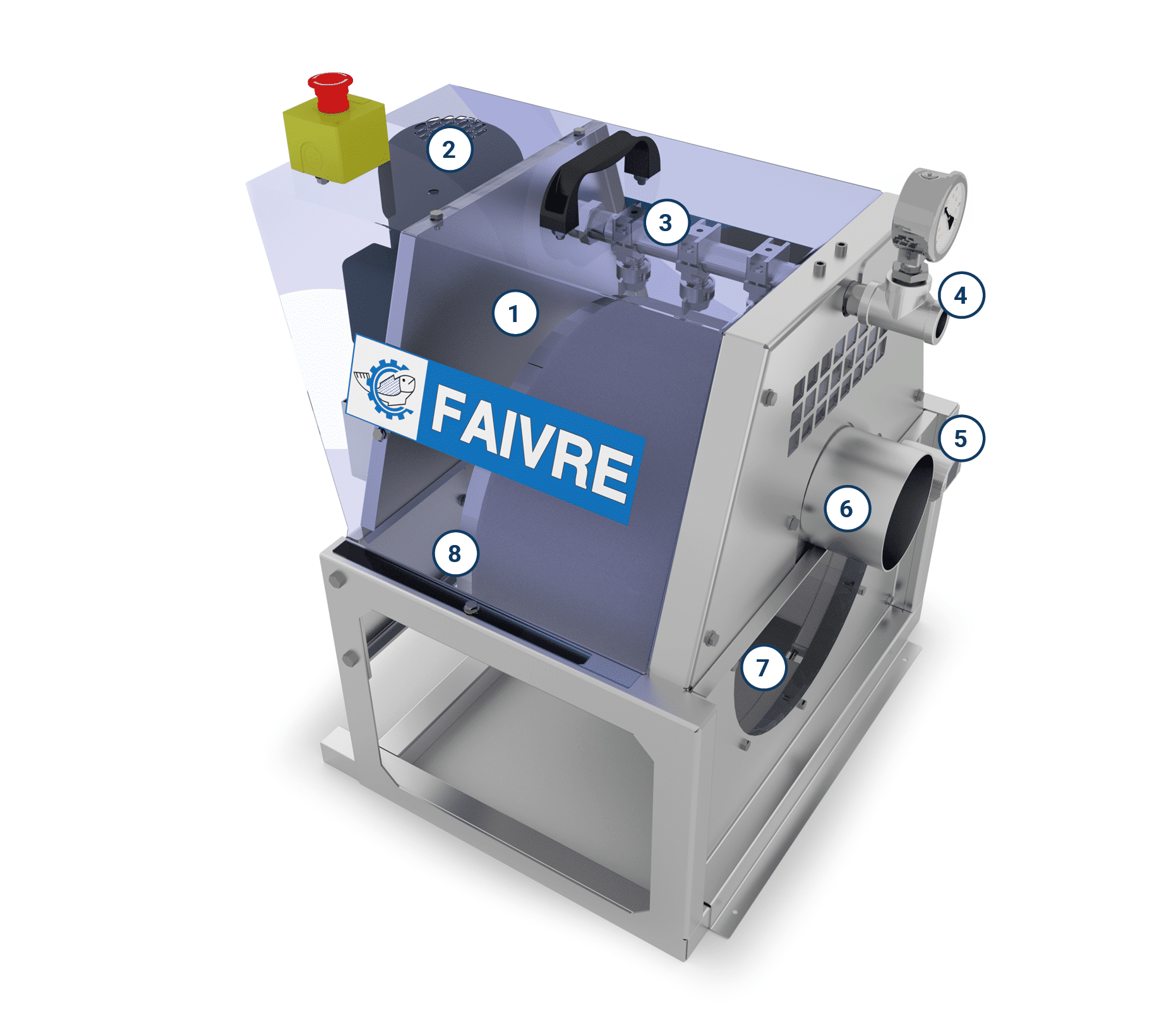 – 2 arrêts d’urgences dont 1 en façade du coffret, 1 autre arrêt d’urgence est positionné sur le filtre à tambour.