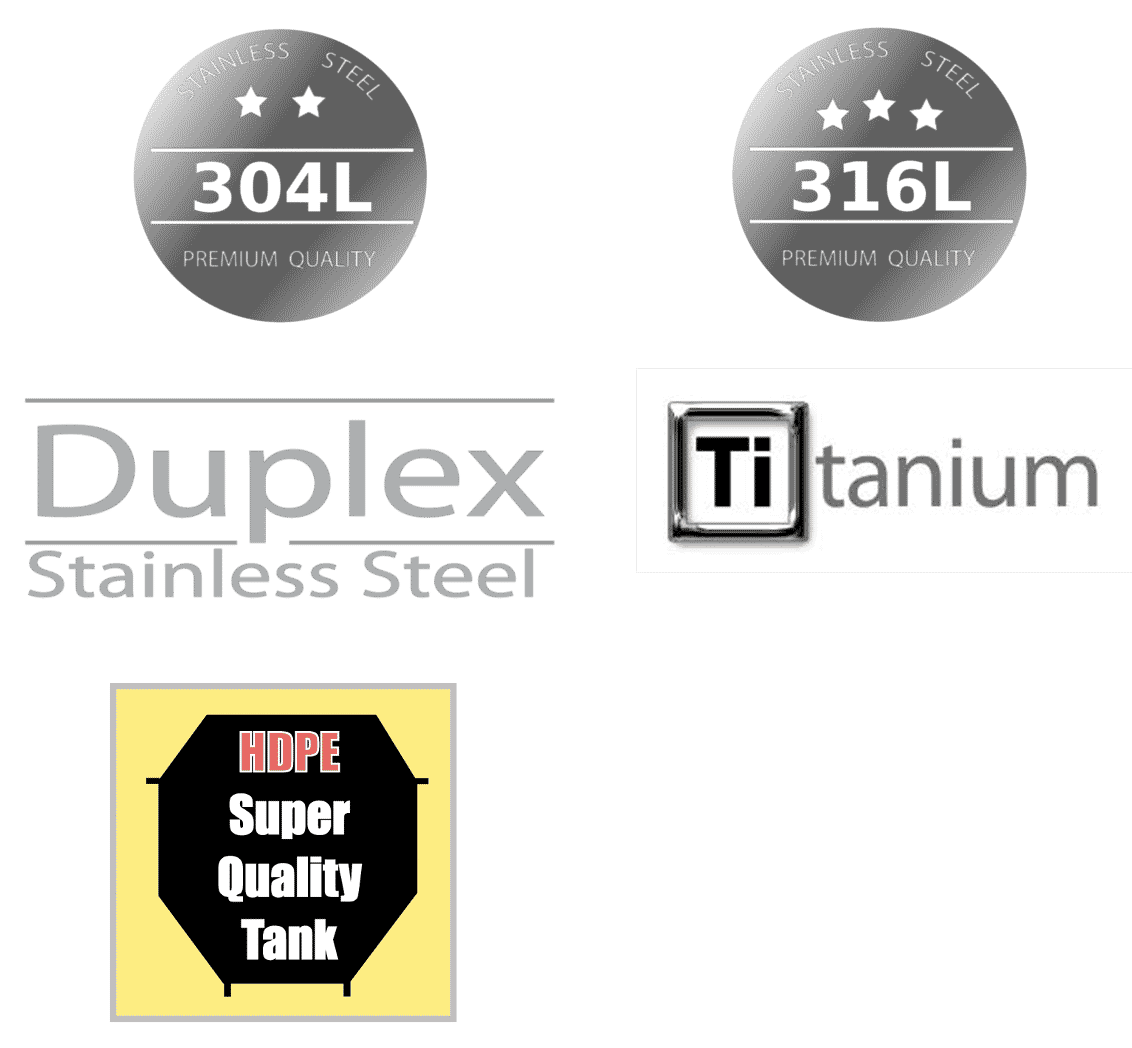 – Inox DUPLEX (2205), SUPER DUPLEX (2507), HDPE et Titane pour eau de mer chaude.
