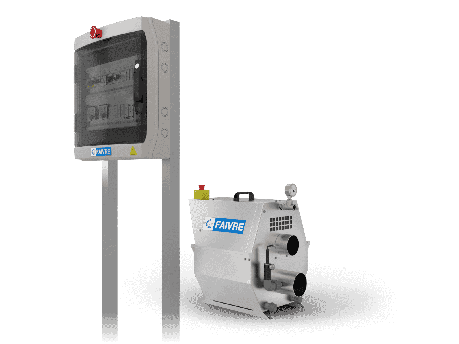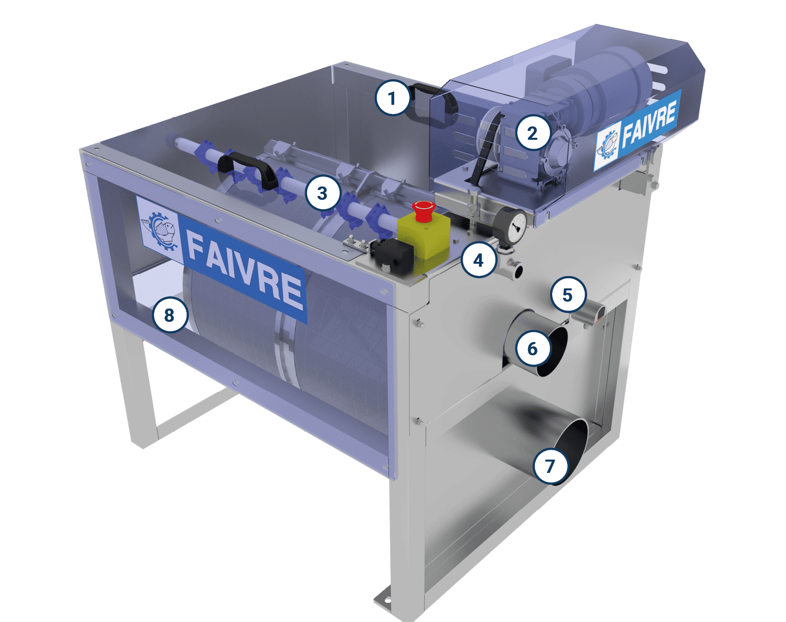 – 2 arrêts d’urgence dont 1 en façade du coffret, 1 autre arrêt d’urgence est positionné sur le filtre à tambour.