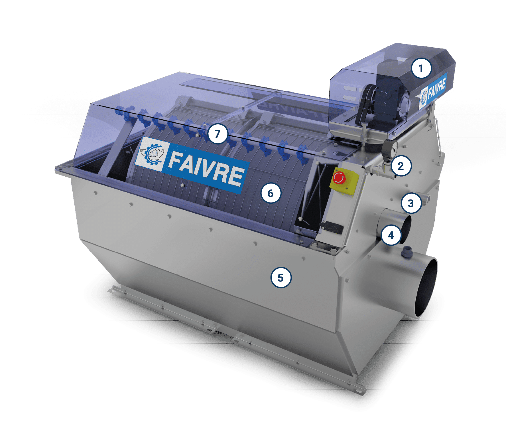 Le principe de fonctionnement est simple : le liquide à filtrer est déversé dans un tambour rotatif. Ce tambour est composé à sa périphérie de solides plaques recouvertes de toile Inox. Les impuretés plus grosses que les perforations sont piégées contre la face intérieure des plaques filtrantes. Le tambour tourne lentement (3 à 8 t/m, suivant modèle) et entraîne les impuretés hors de l’eau. Une rampe de rinçage située au sommet du tambour, nettoie alors les plaques pour évacuer les impuretés dans le canal de sortie des boues. Les filtres FAIVRE ont été conçus pour résister à toute corrosion, car ils sont entièrement construits en Inox et PEHD. Les filtres à tambour FAIVRE comportent peu de pièces en mouvement grâce à leur système exclusif de rotation et suspension du tambour par courroies (BDS System). La maintenance est très réduite. La force de ces filtres réside dans les plaques de filtration. Construites selon un procédé unique, elles se remplacent en quelques minutes grâce à un système de fixation exclusif. Nous vous proposons donc une gamme complète de filtres performants, robustes et économiques à l’utilisation.