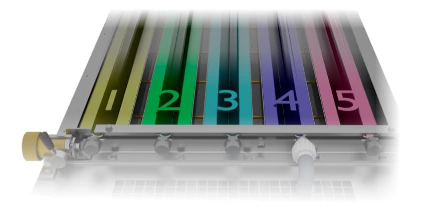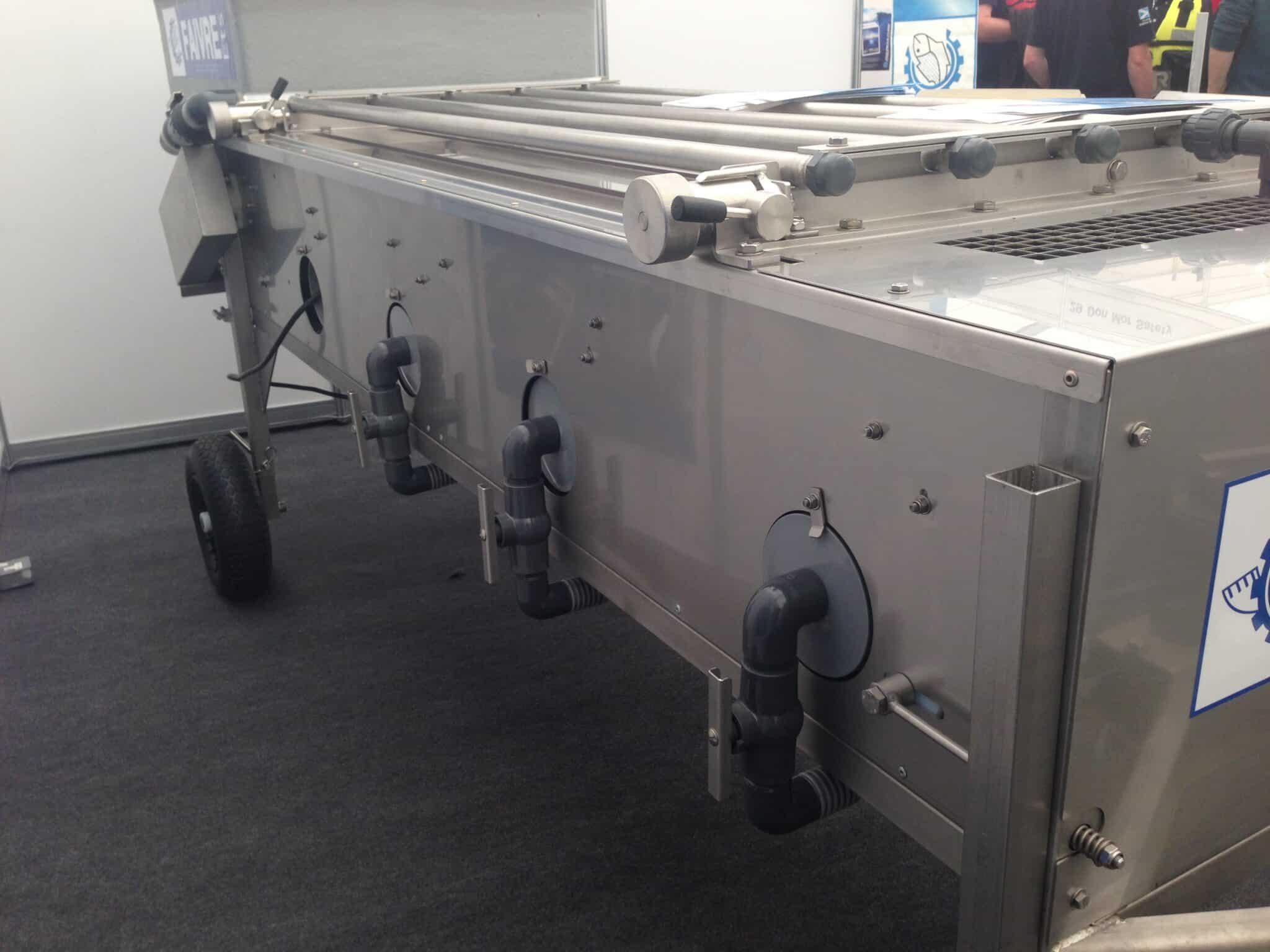 Les canaux de tri sont arrosés en permanence avec des rampes inox perforées placées au centre de chaque canal de tri. Le débit d’eau est réglable par une vanne. Dans la trémie de réception chaque taille possède sa propre arrivée d’eau réglable par une vanne.