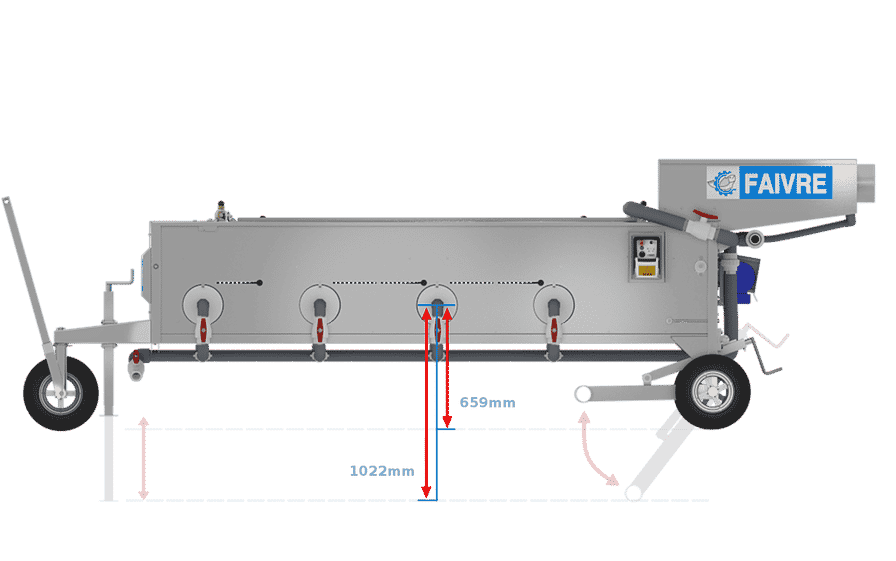 2 crics inox placés à chaque extrémité de la machine permettent de rehausser le trieur de 35 cm max en cas de besoin et de régler précisément l’inclinaison du plan de calibrage afin d’affiner la précision de votre tri.